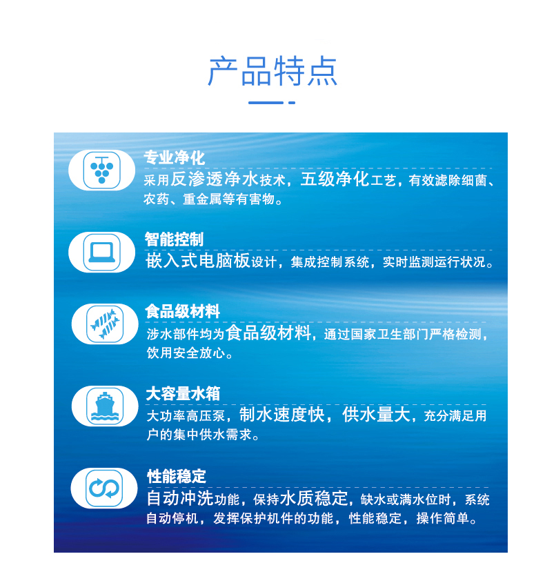 現(xiàn)制現(xiàn)飲,保障水質(zhì)新鮮。擁有專(zhuān)利反滲透高精度濾芯、UV即時(shí)抑菌技術(shù),真正有效地濾除水中雜質(zhì),保證飲水安全。而且可以同時(shí)提供高溫?zé)崴统厮糠謾C(jī)型亦可提供冰水,滿足用戶不同的飲用需求。