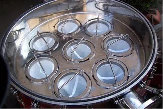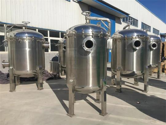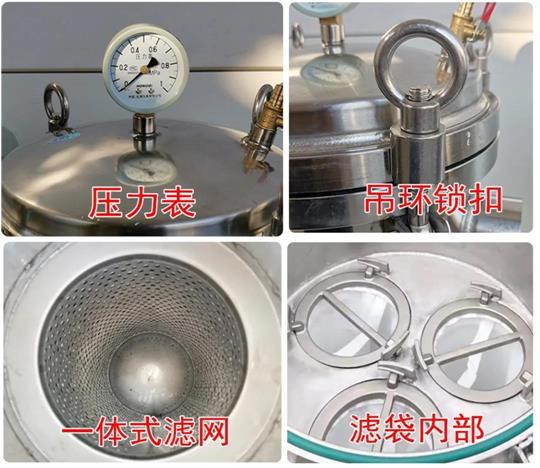 袋式過濾器是一種壓力式過濾裝置,主要由過濾筒體、過濾筒蓋和快開機構(gòu)、不銹鋼濾袋加強網(wǎng)等主要部件組成,濾液由過濾器外殼的旁側(cè)入口管流入濾袋,濾袋本身是裝置在加強網(wǎng)籃內(nèi),液體滲透過所需要細度等級的濾袋即可獲得合格的濾液。